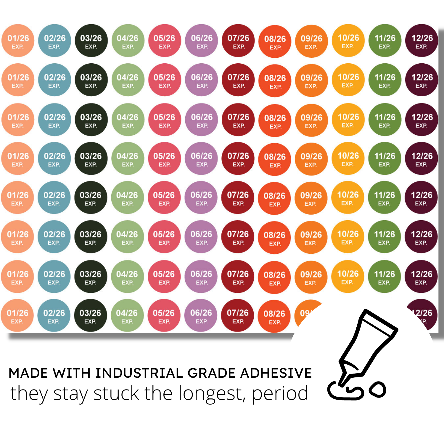 - STAY STUCK THE LONGEST, PERIOD - Industrial Grade - Won’t Peel, Tear or Fade: While most stickers fall off, tear off, or fade into perplexing colors that make you toss good product, we combined industrial grade adhesion with the richest, UV defiant inks - so these date stickers stay stuck & easily identified for years to come.